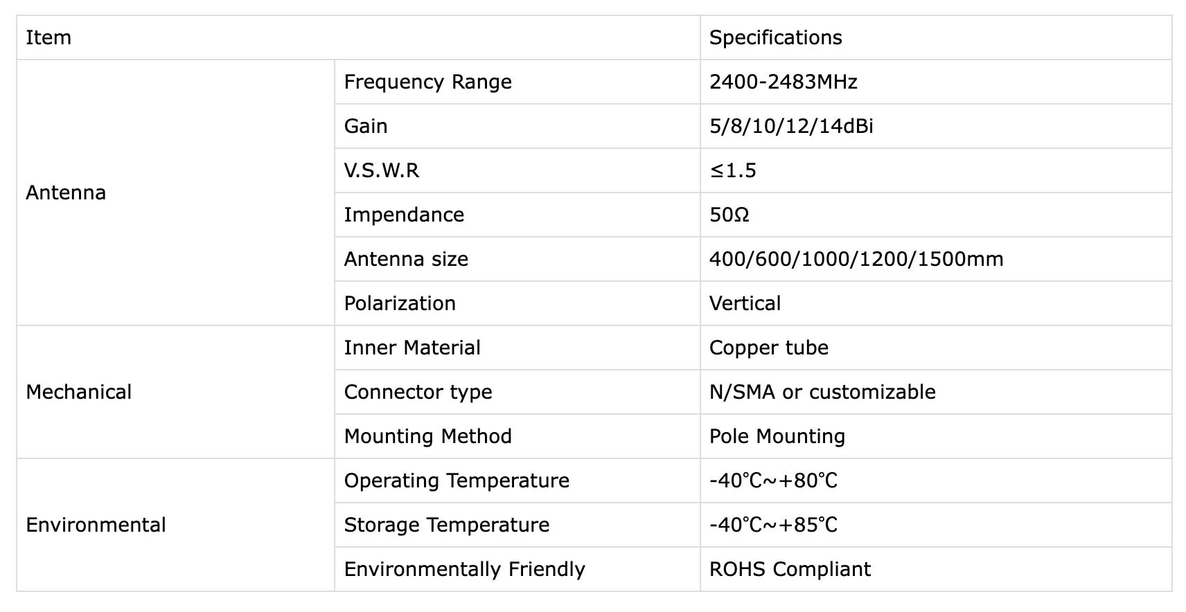 2.4GHz玻璃钢室外天线,N/J公头/定制接头,长度定制,防护等级IP67,防紫外线/不会开裂/抗风/防水,广泛应用于室外、野外等恶劣环境